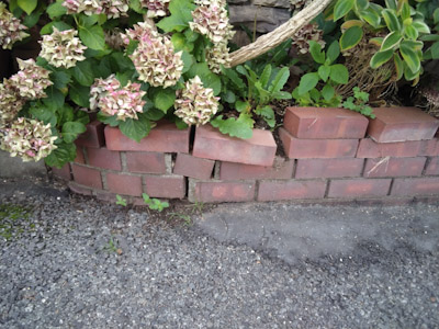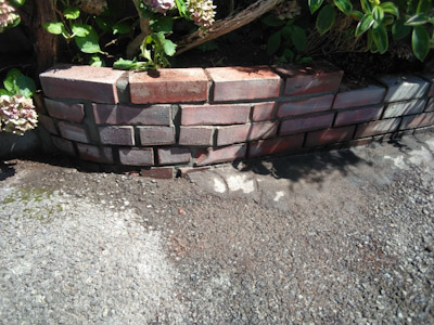 レンガの花壇補修。経年劣化と根っこが押してレンガが崩壊、補修です。