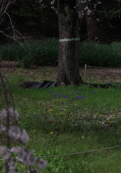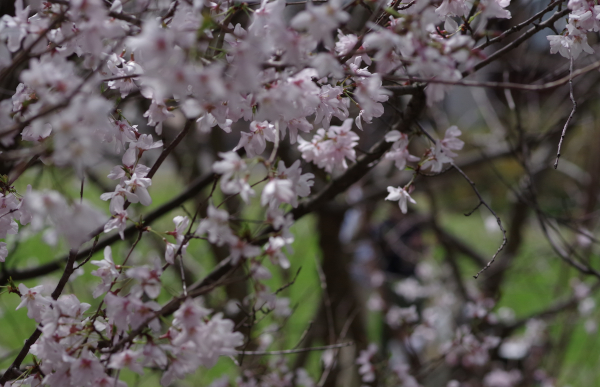 こちらは二本の枝垂れ桜が重なっているのですが、奥の白い花をつける方の幹に緑の帯がまかれています。弱ってるのかな。こちらの桜は、ほんとに豪華なんですが、、、