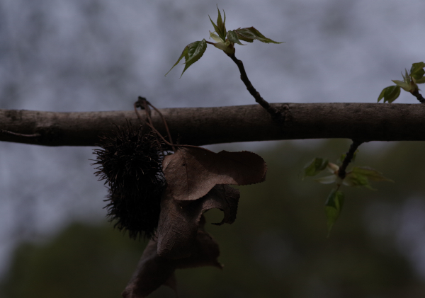 モミジバフウが大きく枝を伸ばして、新芽と実の対比がいい感じです。