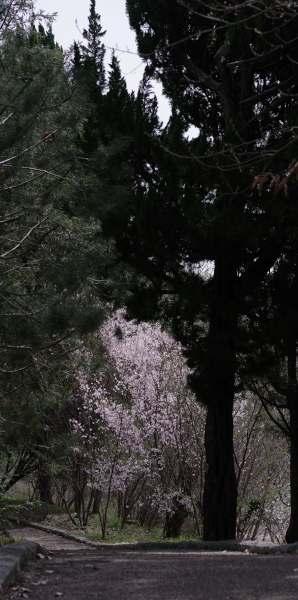 ここでこの植物園の一番奥まで来ました。おりかえしましょ。池のほとりに桃と利休梅が咲いてます。