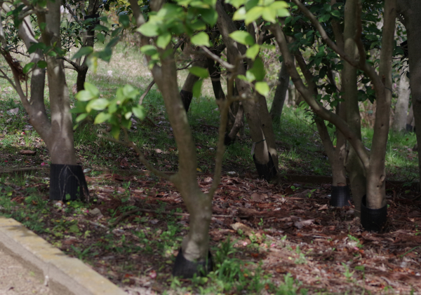 椿園で気になるものが、、、椿の足元だけ黒いメッシュがまかれています。